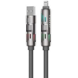 یک کابل برای 4 رابط مختلف این کابل منحصر به فرد با پشتیبانی از 4 رابط مختلف، تقریباً تمام دستگاه های الکترونیکی را پوشش می دهد. آیفون، دستگاه های تایپسی (اندروید)، USB-C و حتی دستگاه های قدیمی تر، همه می توانند از این کابل استفاده کنند. دیگر نیازی نیست چندین کابل مختلف خریداری کنید یا همراه داشته باشید.