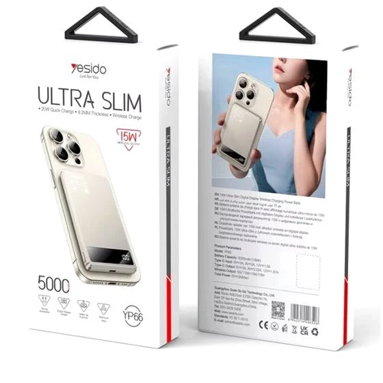 پاوربانک مگسیف یسیدو مدل YP66 با ظرفیت 5000 میلیآمپر ساعت، مجهز به شارژ بیسیم 15 وات MagSafe و شارژ سیمی سریع 20 وات از طریق درگاه Type-C است. بدنه آلیاژ آلومینیوم براق، وزن سبک 121 گرم و ابعاد فشرده آن را به همراه روزمره ایدهآل تبدیل کرده است.