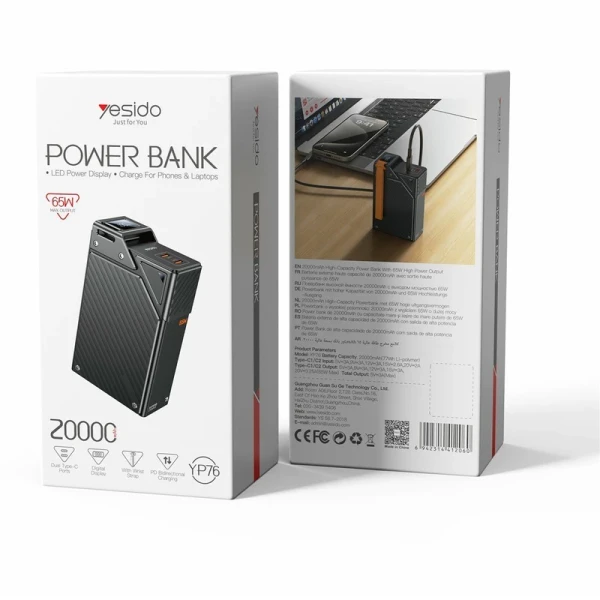 پاوربانک یسیدو YP76 با ظرفیت 20000 میلیآمپر ساعت و توان خروجی 65 وات PD، دارای دو خروجی Type-C با پشتیبانی از شارژ سریع است. بدنه PC+ABS مقاوم در برابر فشار و ضربه، باتری لیتیوم پلیمری، نمایشگر LED و بند سیلیکونی از ویژگیهای این پاوربانک است.