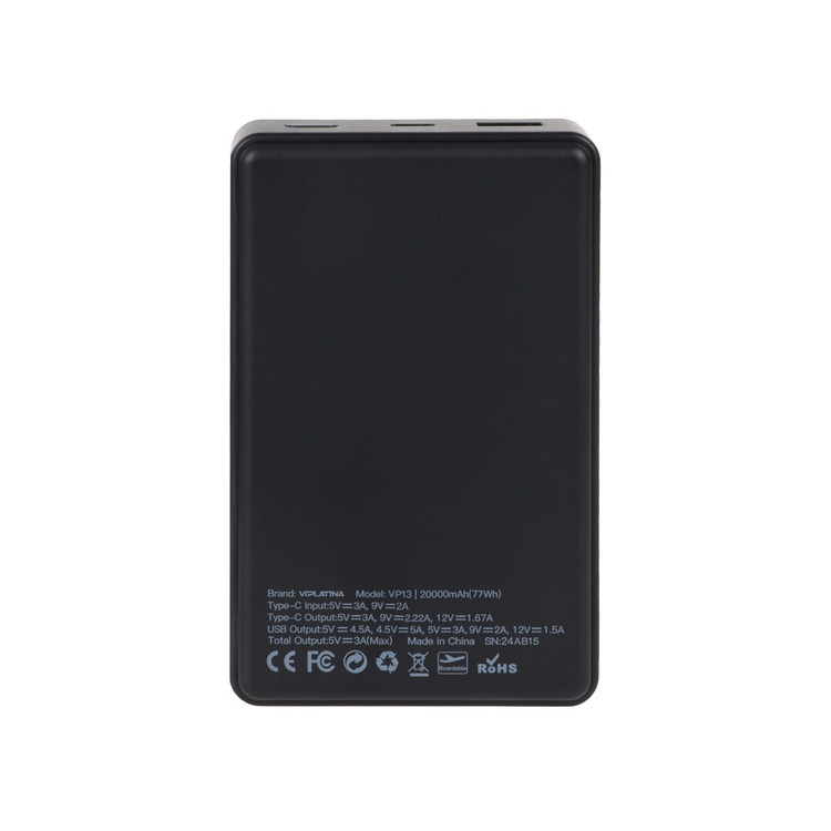پاوربانک VIPLATINA مدل VP13 با ظرفیت 20000 میلیآمپر ساعت و توان خروجی 22.5 وات، دارای دو درگاه خروجی و دو درگاه ورودی USB-A و USB-C است. طراحی شیک به رنگ مشکی با کلاس وزنی معمولی (200 تا 400 گرم)، همراه مطمئنی برای استفاده روزانه است.