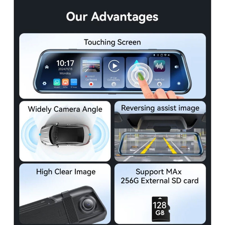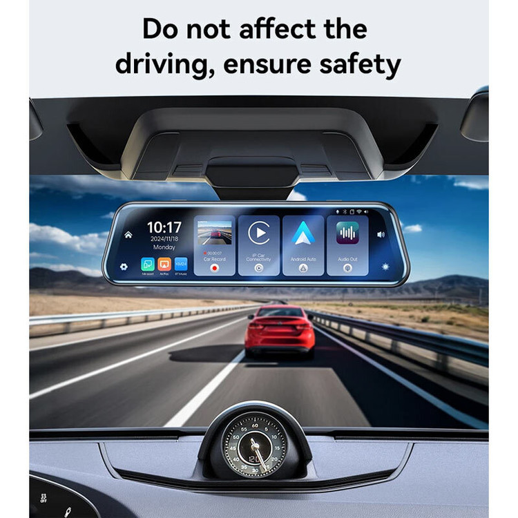 یکی از برجستهترین ویژگیهای KM24، پشتیبانی کامل از Android Auto، Apple CarPlay و AirPlay است. با اتصال گوشی اندرویدی یا آیفون خود، میتوانید مسیریابی Google Maps یا Waze، پخش موسیقی و مدیریت تماسها را مستقیماً از روی نمایشگر بزرگ KM24 انجام دهید. بلوتوث نسخه 5.2، WiFi، ورودی AUX و فرستنده FM اتصال به سیستم صوتی خودرو را نیز ممکن میسازند. دستگاه از طریق شارژر فندکی Type-C تغذیه میشود و نصب آن روی آینه خودرو با گیرههای تعبیهشده بسیار ساده است.
